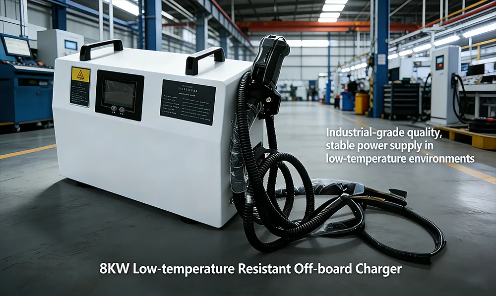 8KW Aşağı Temperatur Davamlı Bortdankənar Şarj Cihazı aşağı temperaturlu mühitlər üçün xüsusi olaraq hazırlanmış yüksək güclü müstəqil şarj cihazıdır. Onun əsas funksiyası üç fazalı AC gücünü sabit DC gücünə çevirmək, elektrik forkliftləri və yığma maşınları kimi sənaye avadanlıqlarının enerji batareyalarını səmərəli şəkildə doldurmaqdır.
